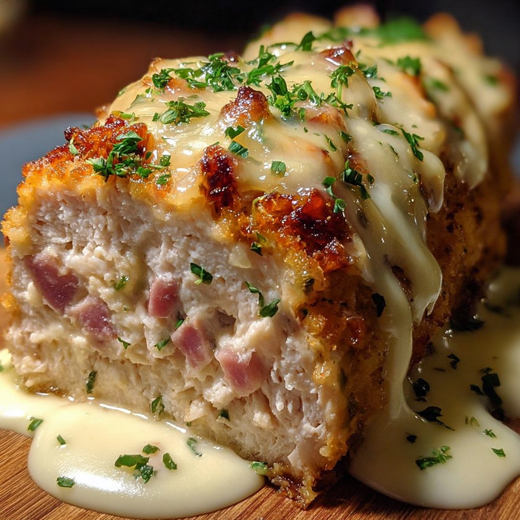 Le pain de viande façon poulet Cordon Bleu présente une surface dorée et légèrement croustillante. L’intérieur révèle le cœur de fromage fondant entouré de jambon, offrant une texture moelleuse et harmonieuse. La découpe montre un contraste visuel et gustatif entre l’extérieur bien cuit et le centre fondant.