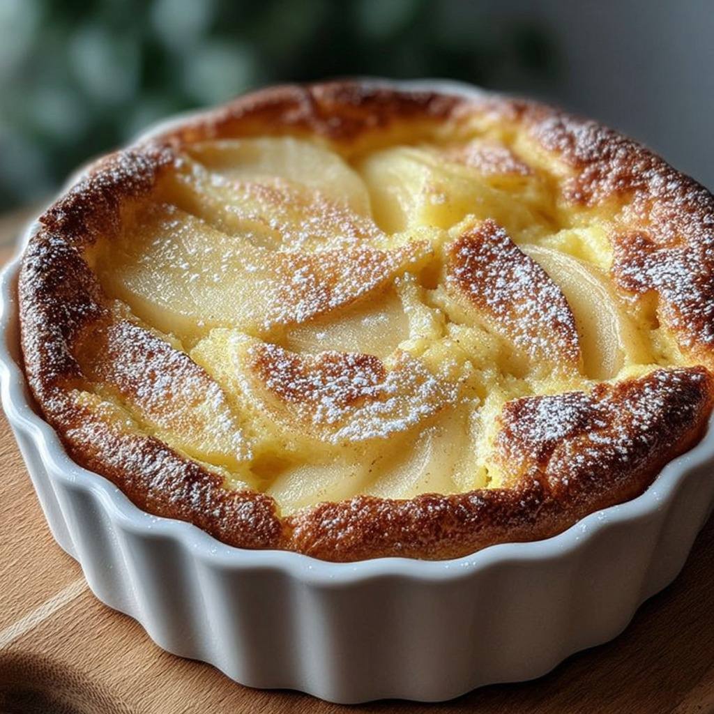 À la dégustation, la pâte aérienne et moelleuse entoure les poires fondantes qui libèrent tout leur parfum. La douceur naturelle des fruits se marie à la légèreté de l’appareil, donnant un dessert à la fois réconfortant et raffiné. Saupoudré légèrement de sucre glace au moment du service, le clafoutis gagne encore en élégance et en gourmandise.