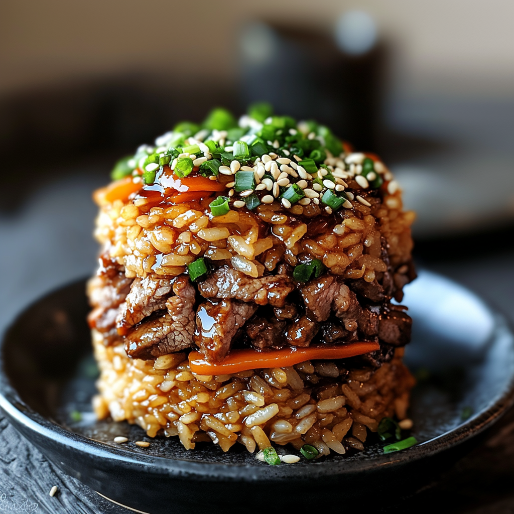 - Accompagnement : Servez ce plat avec une petite salade verte agrémentée de vinaigrette au sésame pour compléter les saveurs du bœuf et du riz.