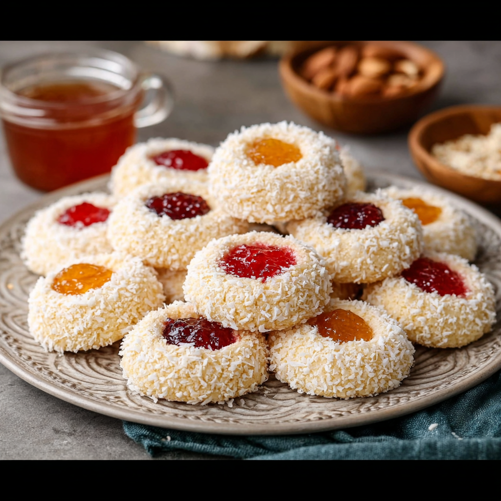 Le contraste entre le sablé doré, la confiture sucrée et la noix de coco râpée rend chaque bouchée irrésistible.