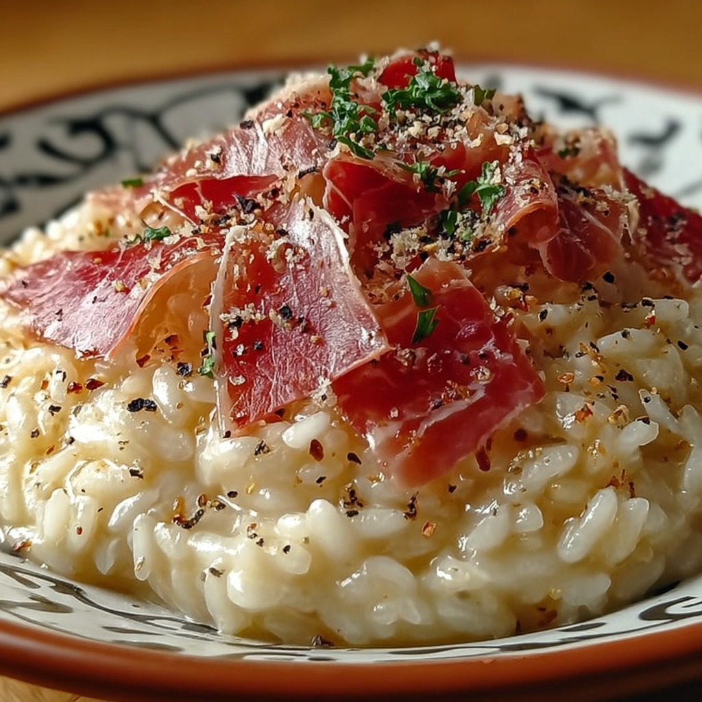 Le risotto au jambon cru est un plat raffiné et savoureux, typique de la cuisine italienne et largement apprécié en Europe. Il allie la texture crémeuse du riz arborio avec la saveur délicate et salée du jambon cru. Ce plat constitue un repas complet et élégant, adapté aussi bien pour un déjeuner gourmand que pour un dîner convivial.
