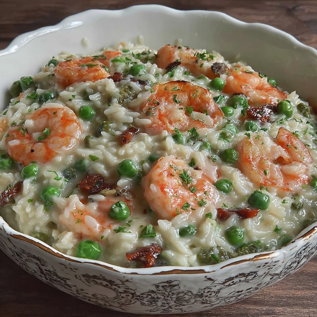 Présenté dans des assiettes creuses, il révèle une consistance onctueuse et brillante. Chaque portion offre une harmonie visuelle entre le vert des petits pois, le rose des crevettes et la blancheur du riz crémeux.