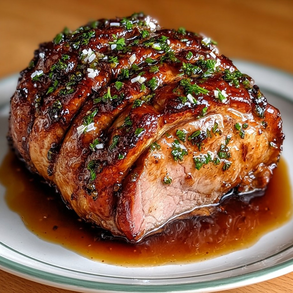 Le roti est tranche regulierement puis dispose sur un plat de service. Les legumes sont repartis autour et le jus caramélisé est verse delicatement par dessus. La presentation reste simple et genereuse mettant en valeur la brillance de la sauce et la couleur doree de la viande.
