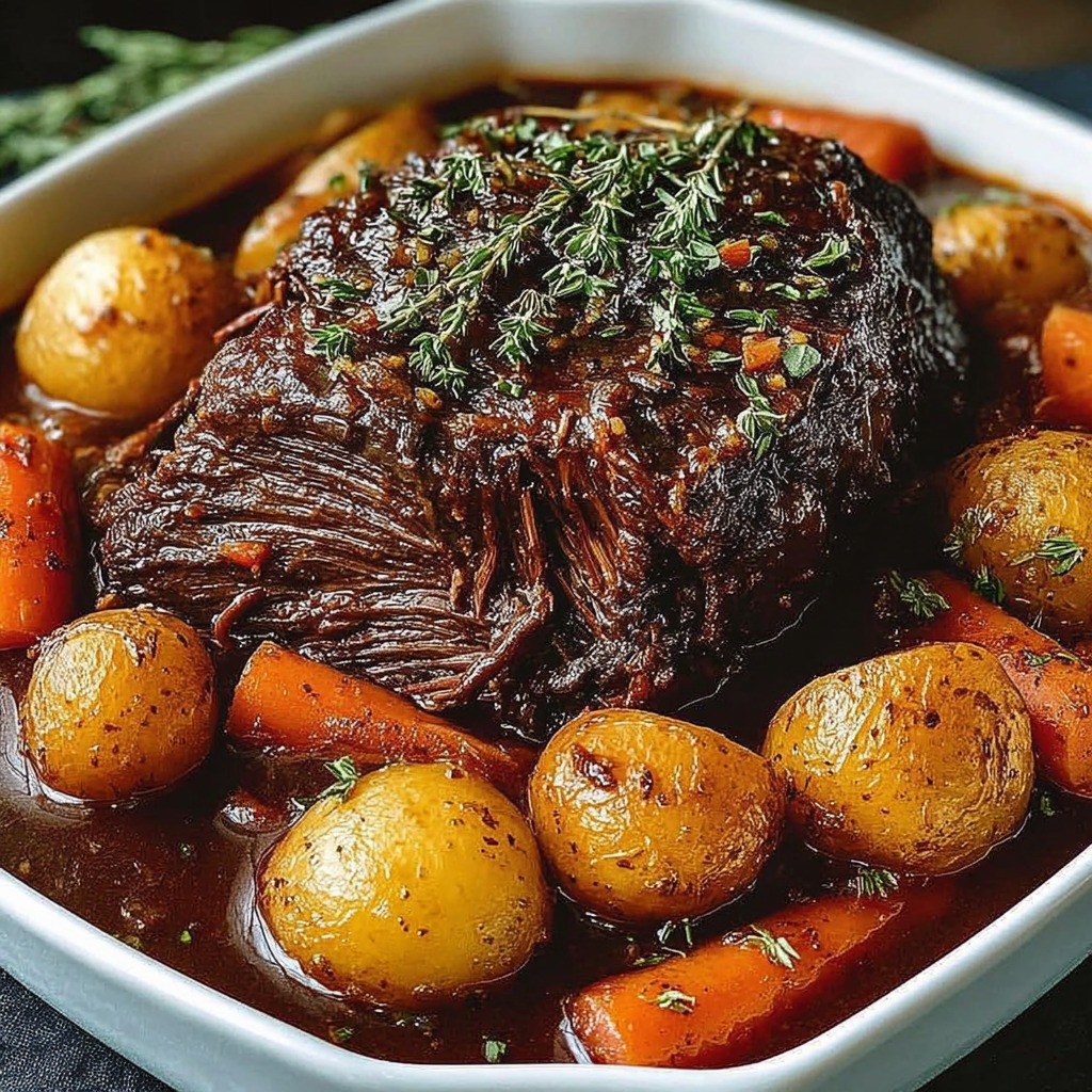 Rôti de Bœuf Braisé Lentement avec Pommes de Terre & Carottes Fondantes