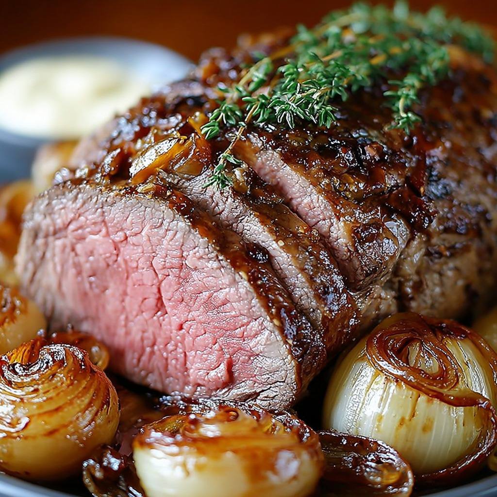 Rôti de bœuf mi-saignant aux oignons caramélisés et thym frais