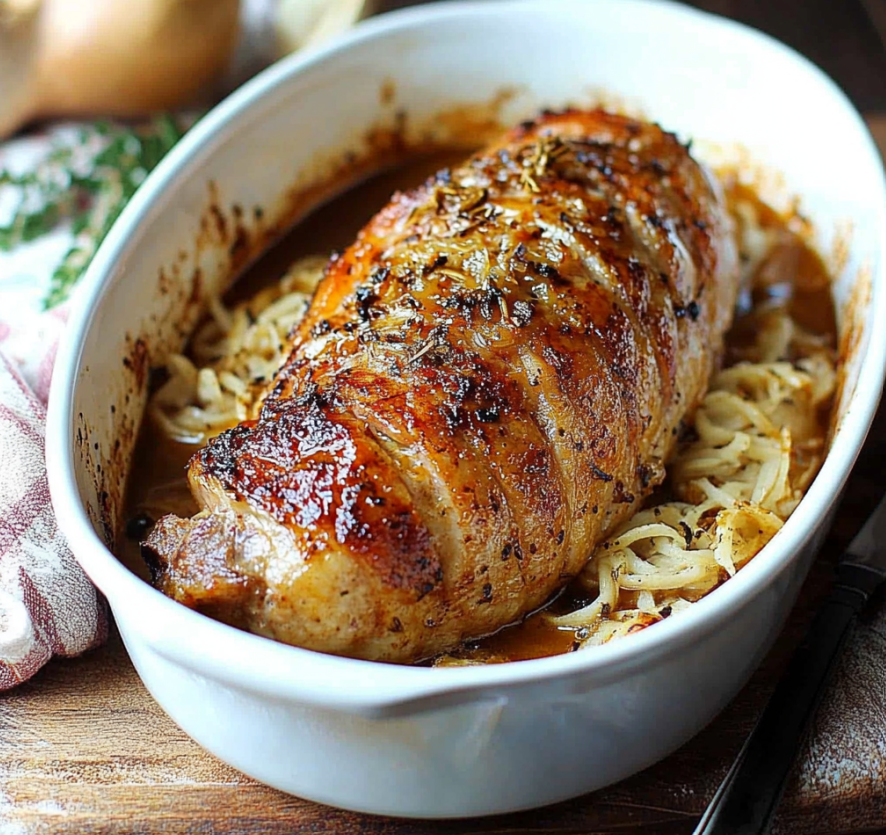 Ce rôti se distingue par sa simplicité et son élégance. L’idée de mariner la viande avec des ingrédients naturels et savoureux – moutarde, miel, ail, oignon et herbes aromatiques – permet de transformer un simple morceau de porc en un plat gastronomique. Le temps de marinade et la cuisson lente au four garantissent une viande fondante et riche en arômes. De plus, la méthode d’arrosage régulier pendant la cuisson assure que le rôti reste juteux et savoureux jusqu’à la dernière bouchée.
