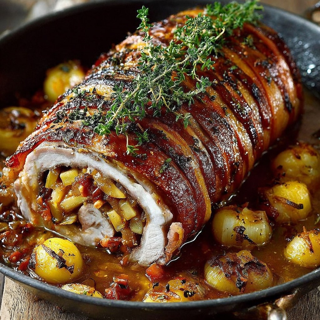 Rôti de porc farci aux pommes et oignons caramélisés