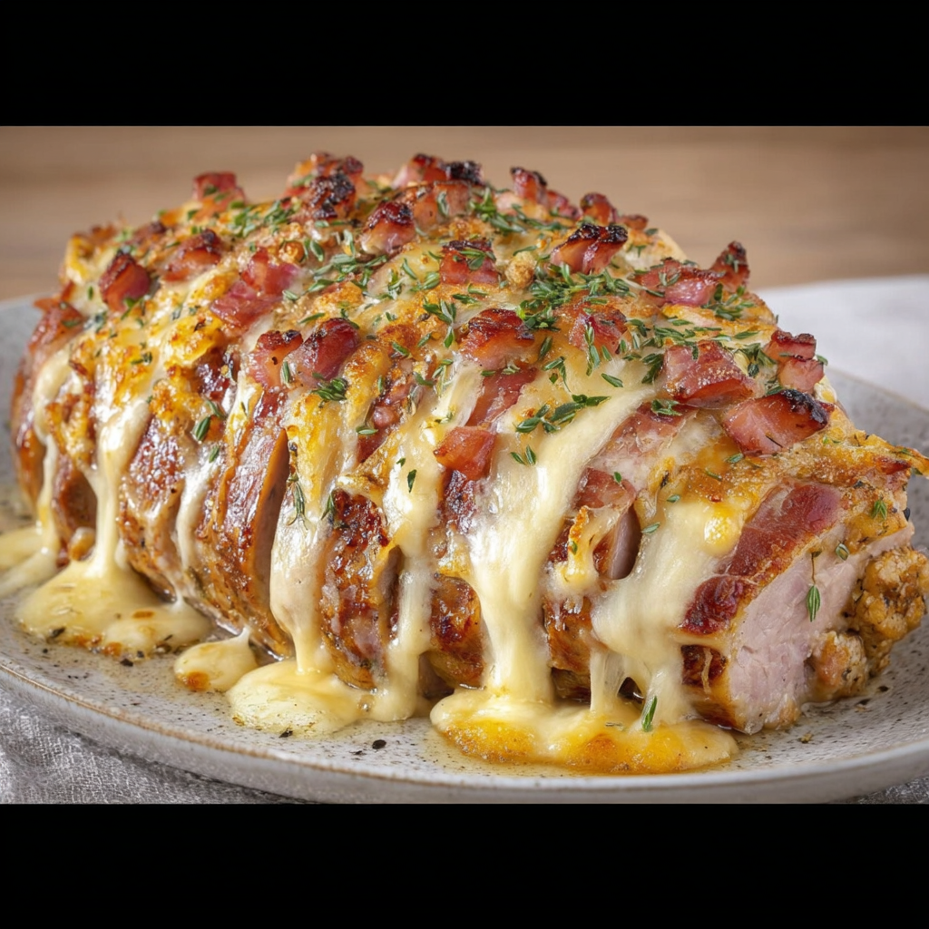 Dans cette version moderne, le rôti de porc est délicatement incisé puis garni de fromage fondant et de bacon savoureux. Le tout est ensuite rôti au four pour obtenir une viande juteuse, parfumée et irrésistiblement gratinée.