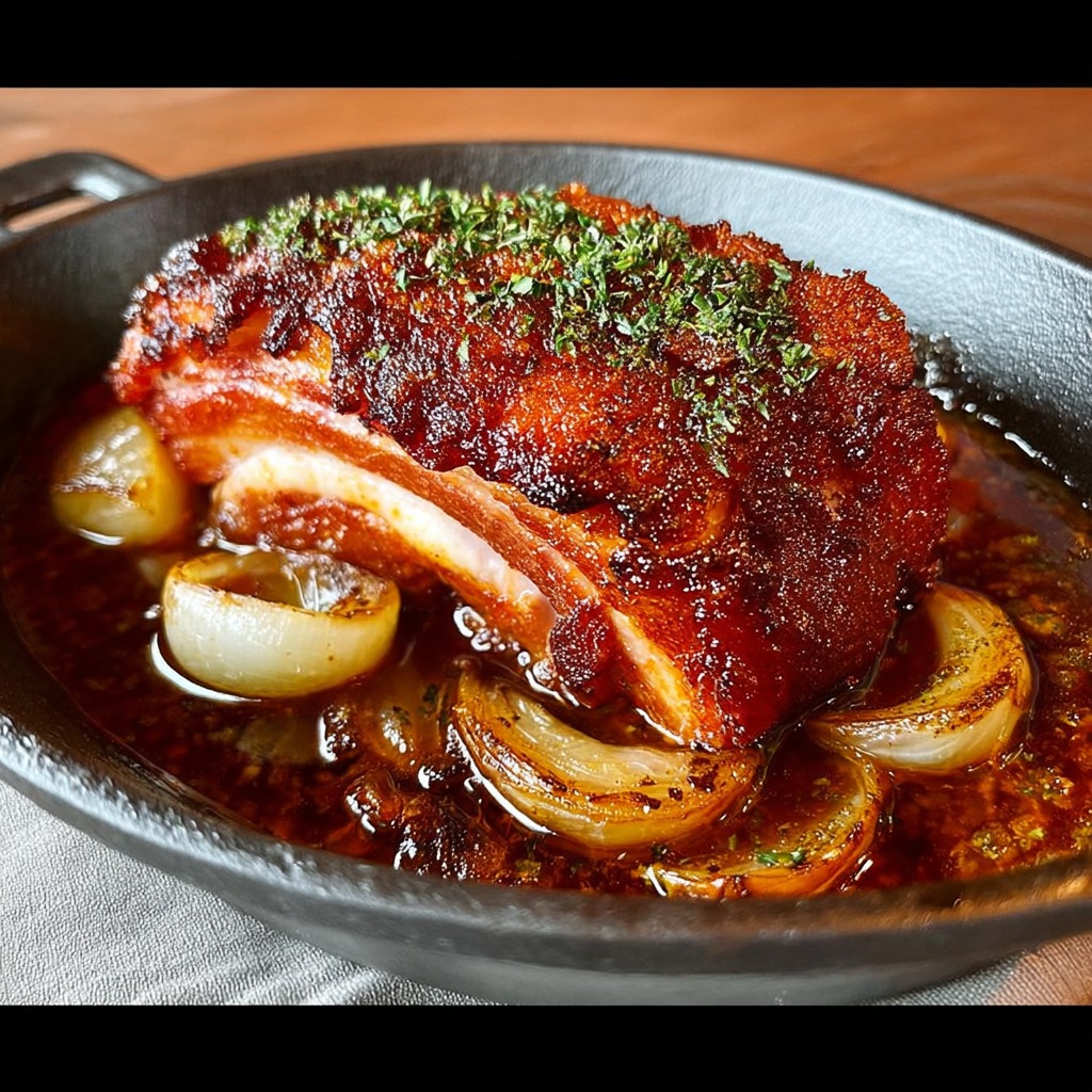 La recette peut être adaptée en ajoutant d’autres aromates ou en modifiant légèrement la base liquide. Toutefois, la version ail et oignons reste la plus emblématique, mettant en valeur la saveur naturelle de la rouelle de porc et la générosité de la cuisson confite.