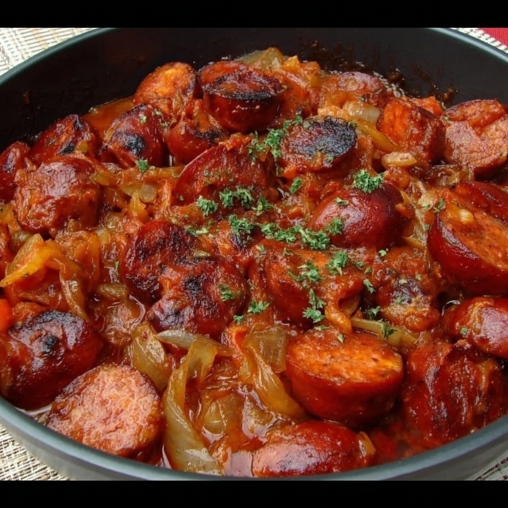 La texture finale est un équilibre entre le moelleux de la sauce, le fondant des aromates et le croquant subtil des saucisses légèrement dorées. Chaque bouchée révèle les différentes couches de saveur et l’harmonie entre les ingrédients.