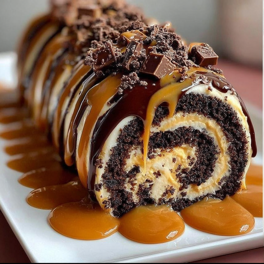Dans cette version, le biscuit moelleux au cacao sert de base, garni d’une crème douce et d’un caramel fondant qui apporte une touche sucrée et légèrement corsée. Le roulage permet de créer de belles spirales visuelles, rendant ce dessert aussi beau que délicieux.