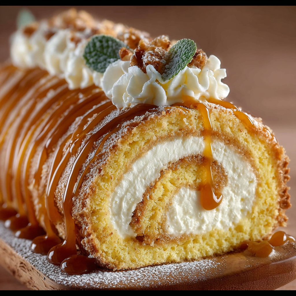 Le roulé à la vanille garni de crème et de caramel au beurre salé est un dessert élégant, gourmand et très apprécié. À la fois léger grâce à sa génoise moelleuse et intensément savoureux grâce à sa garniture crémeuse et son caramel onctueux, ce gâteau roulé fait partie des desserts incontournables de la pâtisserie maison. Sa présentation en spirale révèle un contraste magnifique entre la génoise dorée, la crème délicate à la vanille et le filet de caramel au beurre salé.
