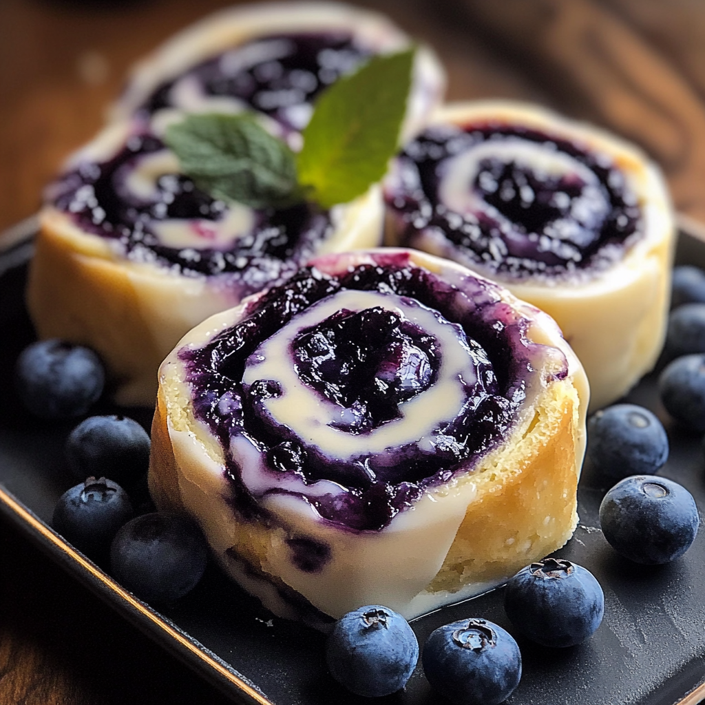 Délicieux rouleaux de cheesecake aux myrtilles avec une touche de chocolat blanc, parfaits pour un dessert rafraîchissant !