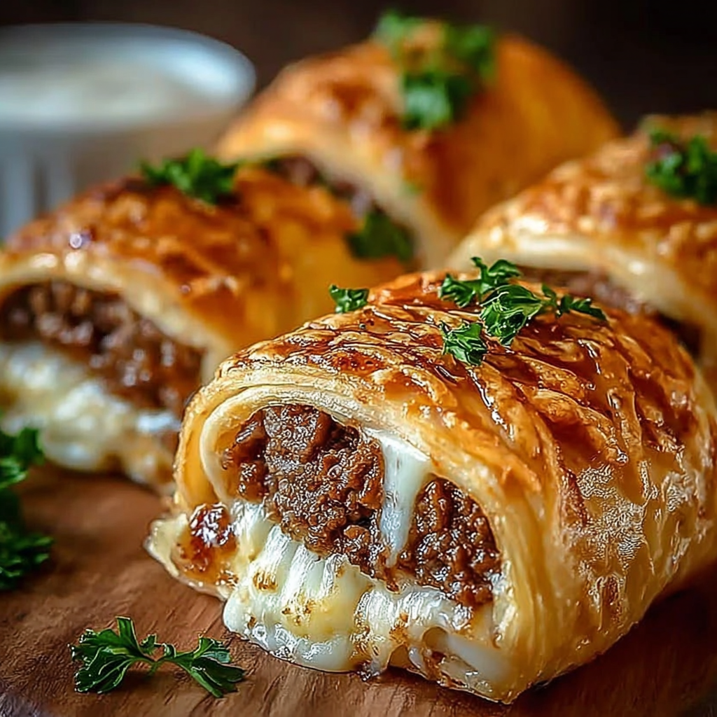 Ces rouleaux de cheeseburger sont une version décadente et fondante du classique burger. Enveloppés dans une pâte moelleuse, garnis de bœuf haché, fromage fondant et bacon croustillant, le tout badigeonné de beurre à l’ail avant la cuisson. Idéals pour un repas convivial, une soirée entre amis ou une soirée télé !