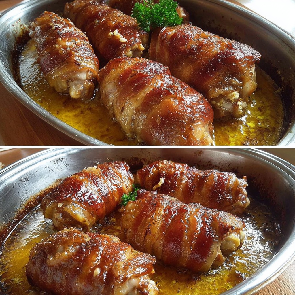 Les roulés peuvent être servis entiers ou tranchés. La découpe révèle une chair fondante enveloppée de lard. Le jus est versé délicatement sur la viande ou proposé à part. La présentation reste simple afin de mettre en valeur la générosité du plat.