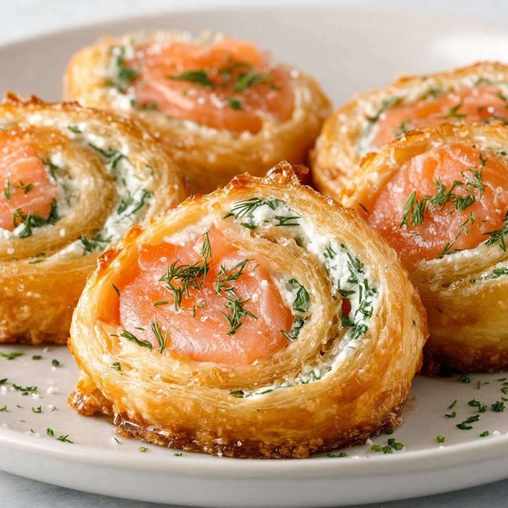 Les roulés saumon-aneth sont de délicieux feuilletés apéritifs à la fois simples à préparer et très élégants à servir. Grâce à l’association du saumon fumé, du fromage frais et de l’aneth parfumée, ces petits roulés offrent une combinaison de saveurs très appréciée. La pâte feuilletée apporte une texture croustillante et légère qui contraste parfaitement avec la garniture crémeuse.