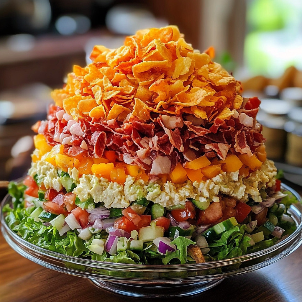 Découvrez cette délicieuse salade BLT en 7 couches, alliant fraîcheur et gourmandise ! Composée de bacon croquant, de fromage cheddar, et d’une variété de légumes colorés, elle est parfaite pour un repas léger ou pour impressionner vos invités lors d’un apéro. Ce plat est facile à préparer et se conserve bien au frais, ce qui le rend idéal pour un repas à l’avance.