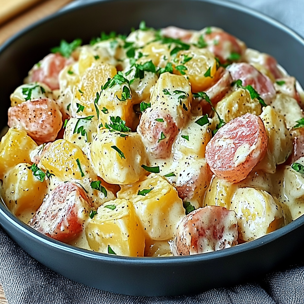 La salade crémeuse aux pommes de terre et knacks fumées est un plat à la fois simple, délicieux et réconfortant. Elle combine la douceur des pommes de terre fondantes, le goût fumé des knacks et une sauce onctueuse qui vient lier l’ensemble de manière parfaite. Que vous soyez à la recherche d’un repas rapide, d’une entrée gourmande ou d’un accompagnement pour vos repas estivaux, cette salade saura séduire les papilles de toute la famille.
