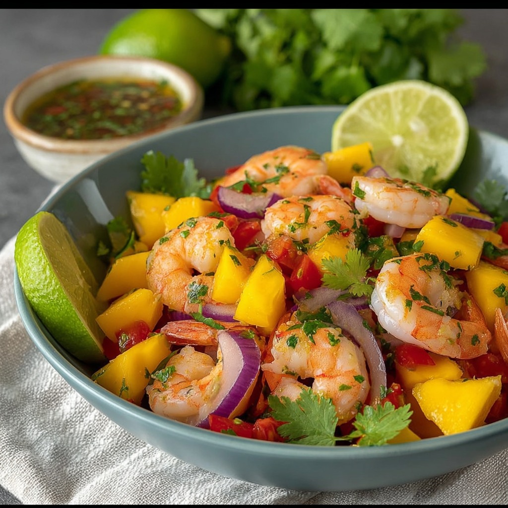 Salade de Crevettes et Mangue est une préparation fraîche et colorée qui met en valeur le contraste entre la douceur fruitée de la mangue, la texture délicate de l’avocat, la fraîcheur du concombre et le goût naturel des crevettes. Cette combinaison simple crée une harmonie équilibrée, à la fois légère et savoureuse. L’ensemble repose sur une découpe précise des ingrédients, une sélection de produits bien mûrs et une vinaigrette douce et acidulée qui lie l’ensemble de manière subtile. Ce type de salade convient parfaitement aux repas estivaux, aux entrées légères ou aux plats rapides où l’on recherche une association de textures variées et un goût rafraîchissant.