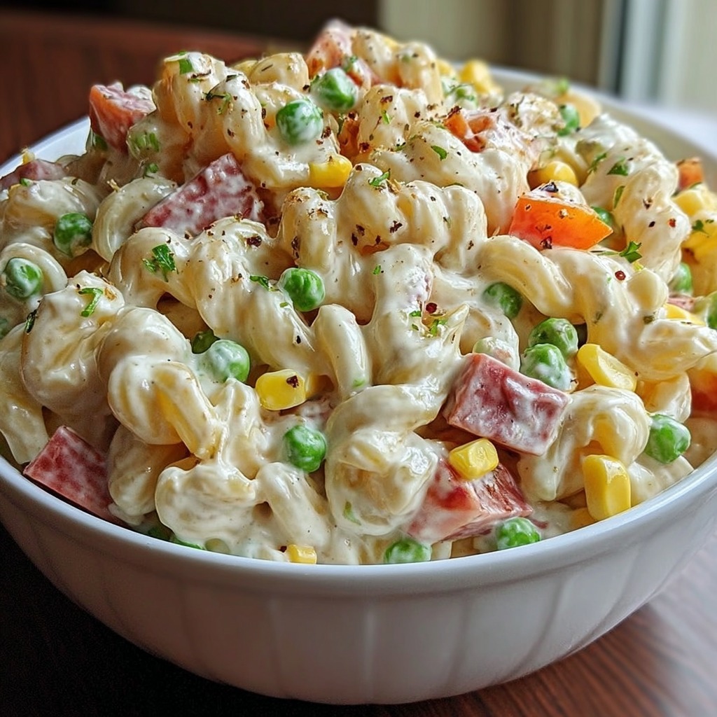 La salade de pâtes crémeuse au jambon, maïs et petits pois est un plat frais, gourmand et équilibré, qui allie moelleux des pâtes, douceur du jambon et croquant des légumes. Facile à préparer et adaptable selon les ingrédients disponibles, elle constitue un repas complet et agréable à partager. Sa fraîcheur, sa couleur et son goût délicat en font une option idéale pour les journées chaudes, les pique-niques ou un d
