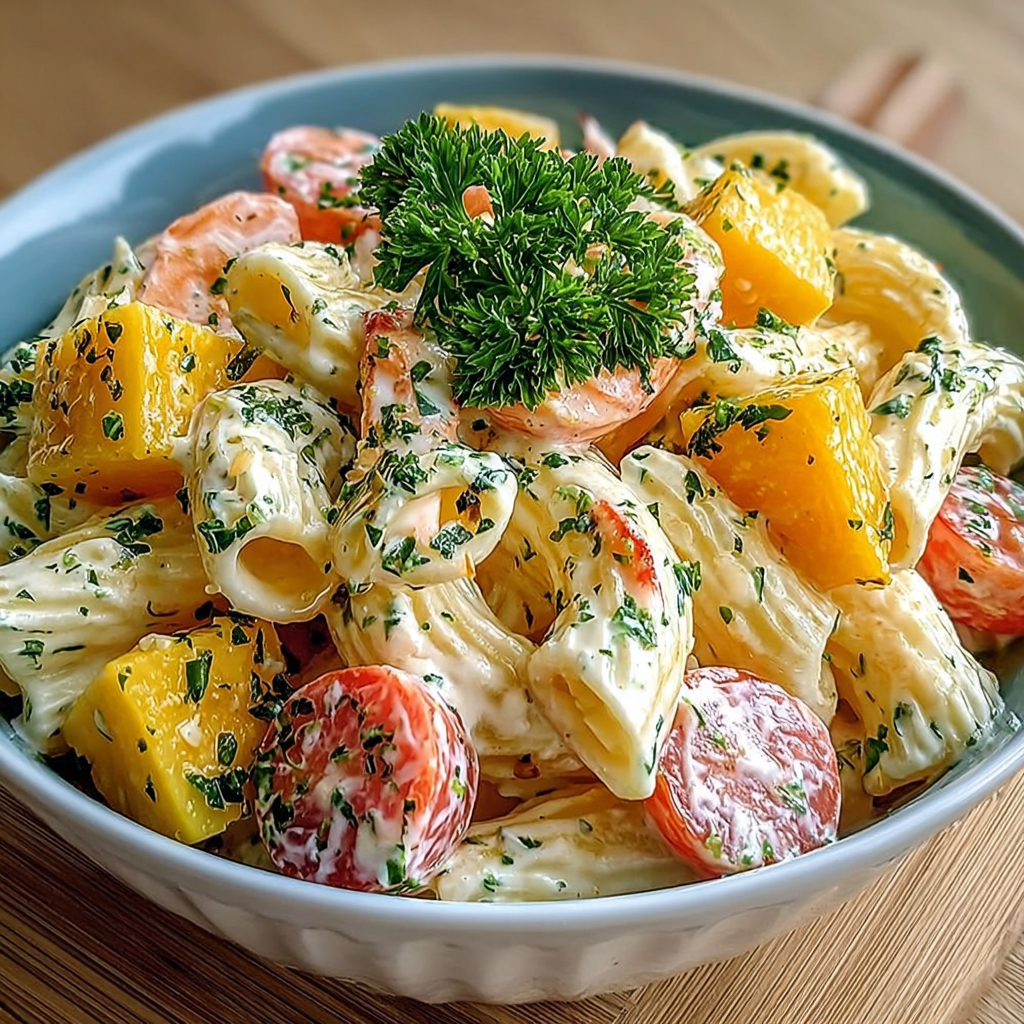 La salade de pâtes crémeuse au surimi, à l’ananas et au fromage est un plat froid à la fois généreux, frais et étonnamment gourmand. L’association du surimi salé, de l’ananas légèrement sucré et du fromage fondant crée un équilibre parfait entre douceur et caractère. Cette salade est idéale pour les grands buffets, les fêtes, les anniversaires, les pique-niques et les repas familiaux. Elle se prépare facilement, peut être réalisée à l’avance et plaît à presque tous les invités.