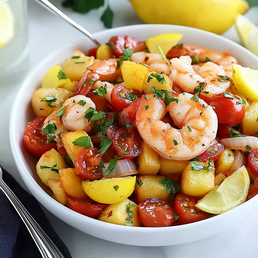 Salade fraîche et gourmande alliant pommes de terre, crevettes et tomates pour un repas léger.