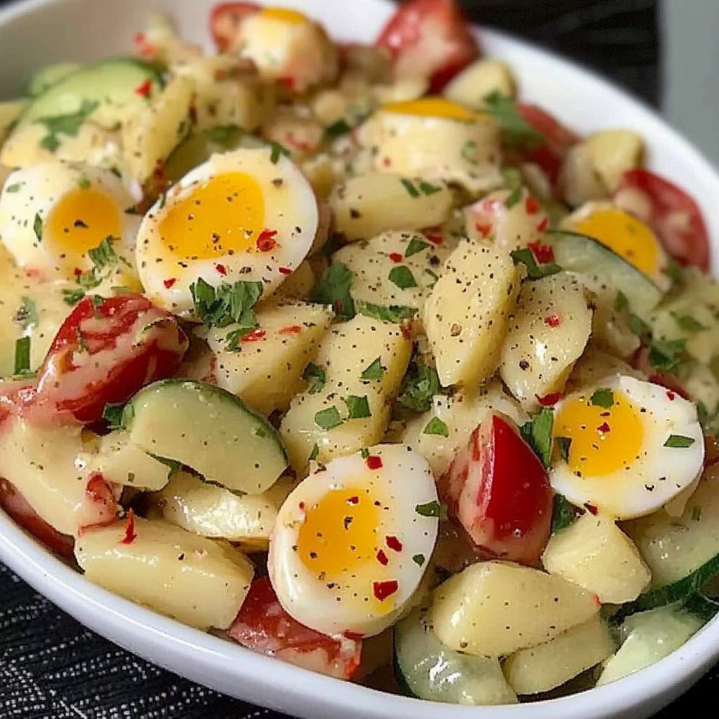 Cette Salade de Pommes de Terre aux Œufs est un plat polyvalent qui peut être servi en tant que plat principal léger ou en accompagnement. L’équilibre entre la crémeuse vinaigrette maison, la fraîcheur des légumes, et la richesse des œufs durs fait de cette salade un véritable délice à chaque bouchée. De plus, elle est facile à préparer et peut être adaptée en fonction de vos goûts et des ingrédients disponibles dans votre cuisine.