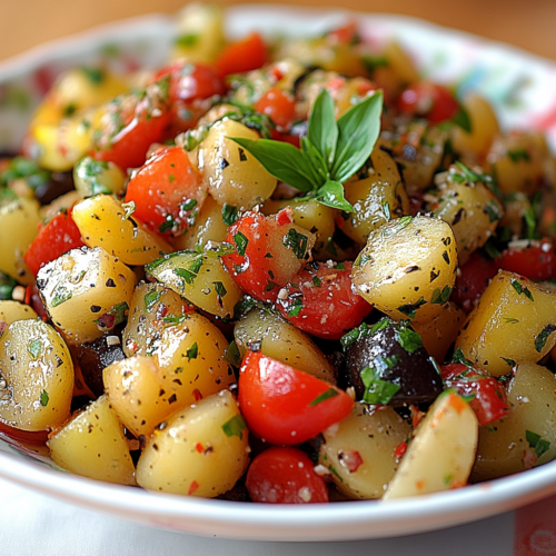 Cette salade de pommes de terre méditerranéenne est un véritable plaisir pour les sens. Elle allie la richesse des pommes de terre à la fraîcheur des légumes et des herbes, tout en étant relevée par une vinaigrette simple mais savoureuse. Facile à préparer, elle se transforme en un plat complet, idéal pour accompagner un barbecue d’été ou servir de déjeuner léger. Si vous êtes à la recherche d’un plat sain et savoureux, cette recette est faite pour vous. Essayez-la dès aujourd’hui et apportez un peu de soleil méditerranéen à votre table !