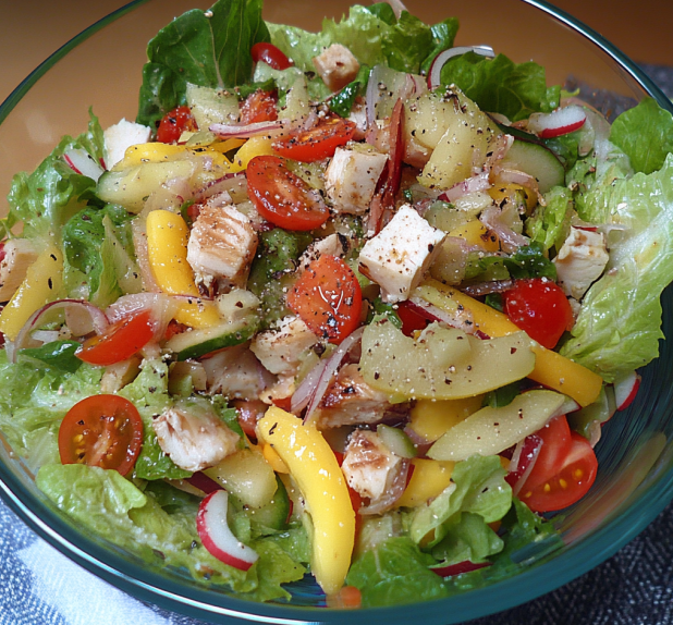 Ce qui rend cette recette particulièrement attrayante, c’est la combinaison harmonieuse d’ingrédients frais et de qualité. La laitue ou le mesclun apporte une base verte croquante, tandis que les tomates, le concombre et les radis offrent des touches acidulées et rafraîchissantes. Les œufs durs, le jambon blanc et le fromage de chèvre frais ajoutent des protéines et une richesse gourmande à l’ensemble. Le tout est relevé par une vinaigrette maison, simple mais efficace, qui unit toutes les saveurs dans un équilibre parfait.