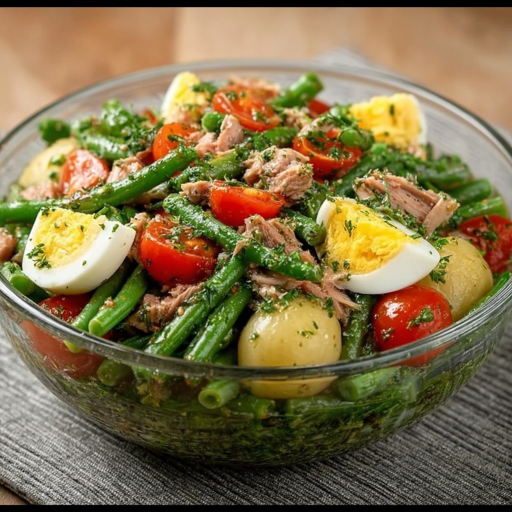 Avec la douceur des haricots verts, la fraîcheur juteuse des tomates mûres, la richesse du thon au naturel et la gourmandise des œufs durs, cette salade constitue un repas complet, rassasiant et pourtant léger. L’huile d’olive vient sublimer l’ensemble avec une touche méditerranéenne simple mais essentielle.