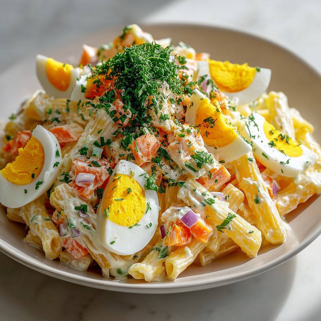 En définitive, la salade de pâtes au surimi et aux œufs durs est un plat polyvalent et apprécié pour sa fraîcheur, sa simplicité et son équilibre nutritionnel. Elle illustre comment des ingrédients simples peuvent être transformés en un repas complet et gourmand, capable de satisfaire petits et grands. Chaque bouchée combine moelleux, croquant et onctuosité, offrant une expérience gustative riche et agréable. C’est un classique des repas d’été et des buffets, qui reste indémodable grâce à sa praticité et à sa saveur harmonieuse.