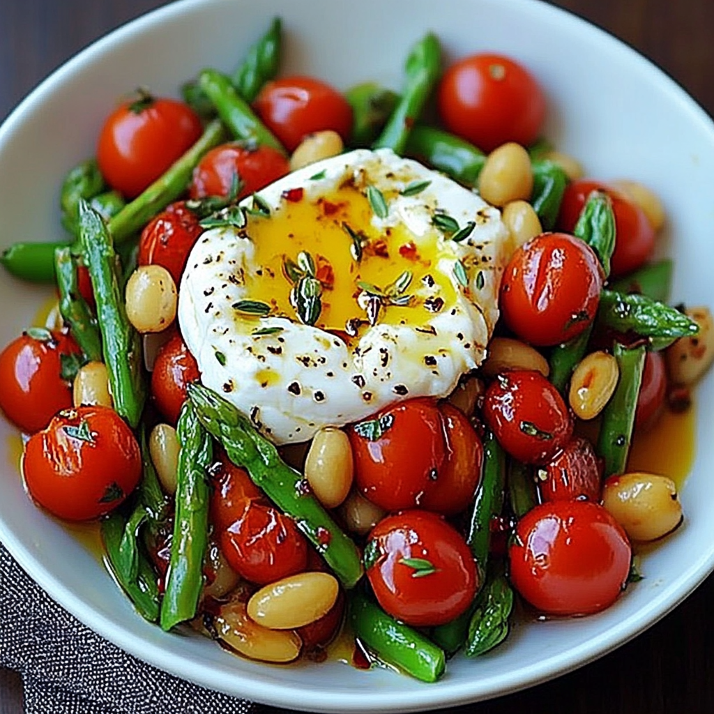 Burrata : Coupez délicatement les boules de burrata en deux et placez-les sur la salade. La burrata ajoutera un côté crémeux et doux, contrastant merveilleusement avec le croquant des asperges et la fraîcheur des tomates.
