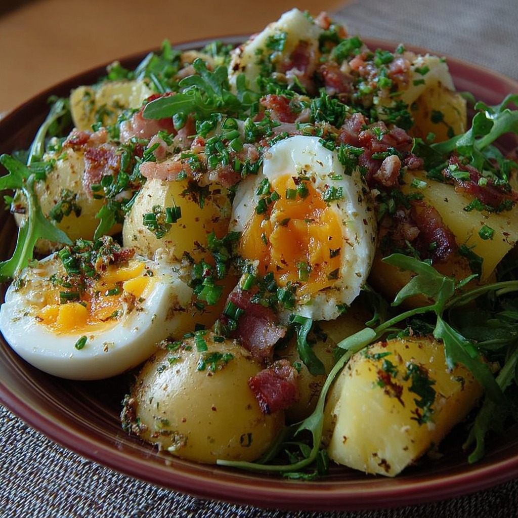 Salade tiède de pommes de terre, œufs mollets et lardons