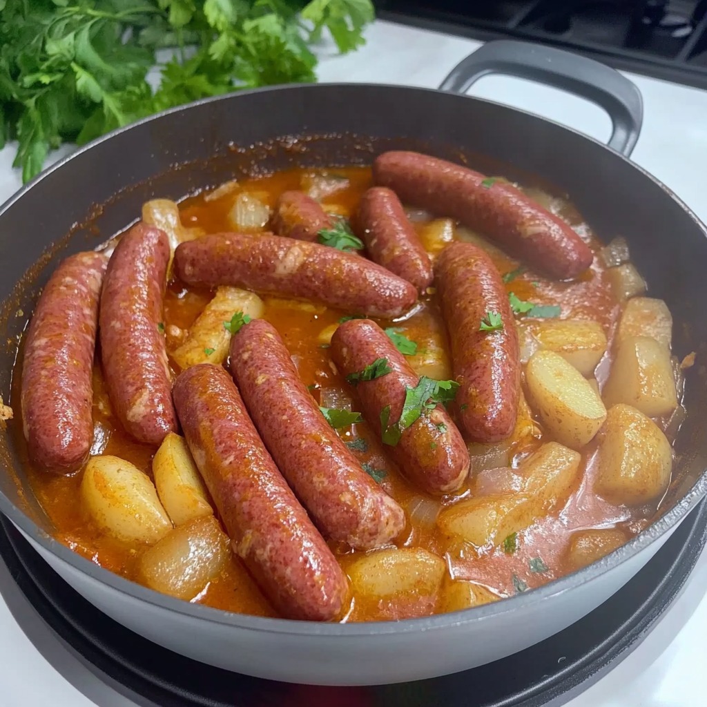 Salchichas en salsa de vino con patatitas, c’est le genre de plat qui rassemble. On le prépare sans stress, on le laisse mijoter doucement, et on profite de son parfum réconfortant qui emplit la cuisine. Parfait en semaine comme le week-end, il est aussi bon chaud que réchauffé… voire meilleur le lendemain !