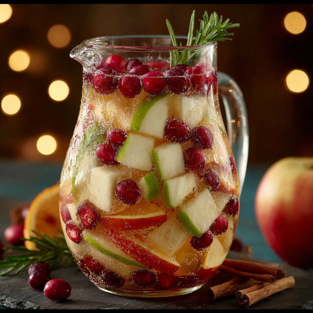 La sangria blanche de Noël sans alcool est une boisson festive, légère et rafraîchissante, idéale pour partager en famille ou entre amis pendant les fêtes. Cette version sans alcool conserve toute la magie de la traditionnelle sangria grâce à la combinaison de jus de fruits frais, de touches épicées et de fruits de saison. Elle se distingue par sa couleur claire et lumineuse, sa saveur douce et parfumée, et son parfum festif qui rappelle les traditions de Noël. Facile à préparer, elle permet de profiter de l’ambiance des fêtes tout en restant accessible à tous, petits et grands.