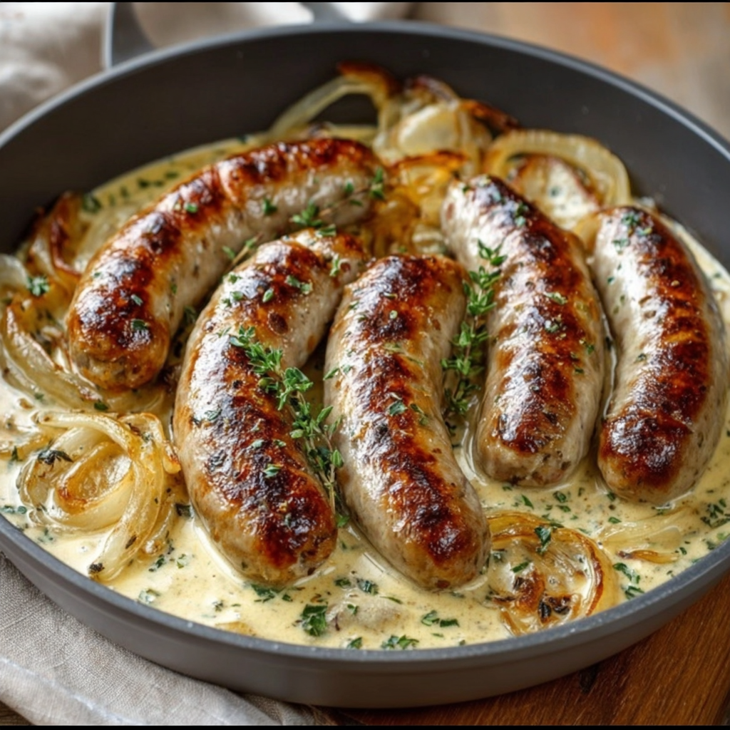 Sauce onctueuse : La crème doit juste napper les oignons et les saucisses ; évitez de trop la faire réduire pour conserver l’onctuosité.