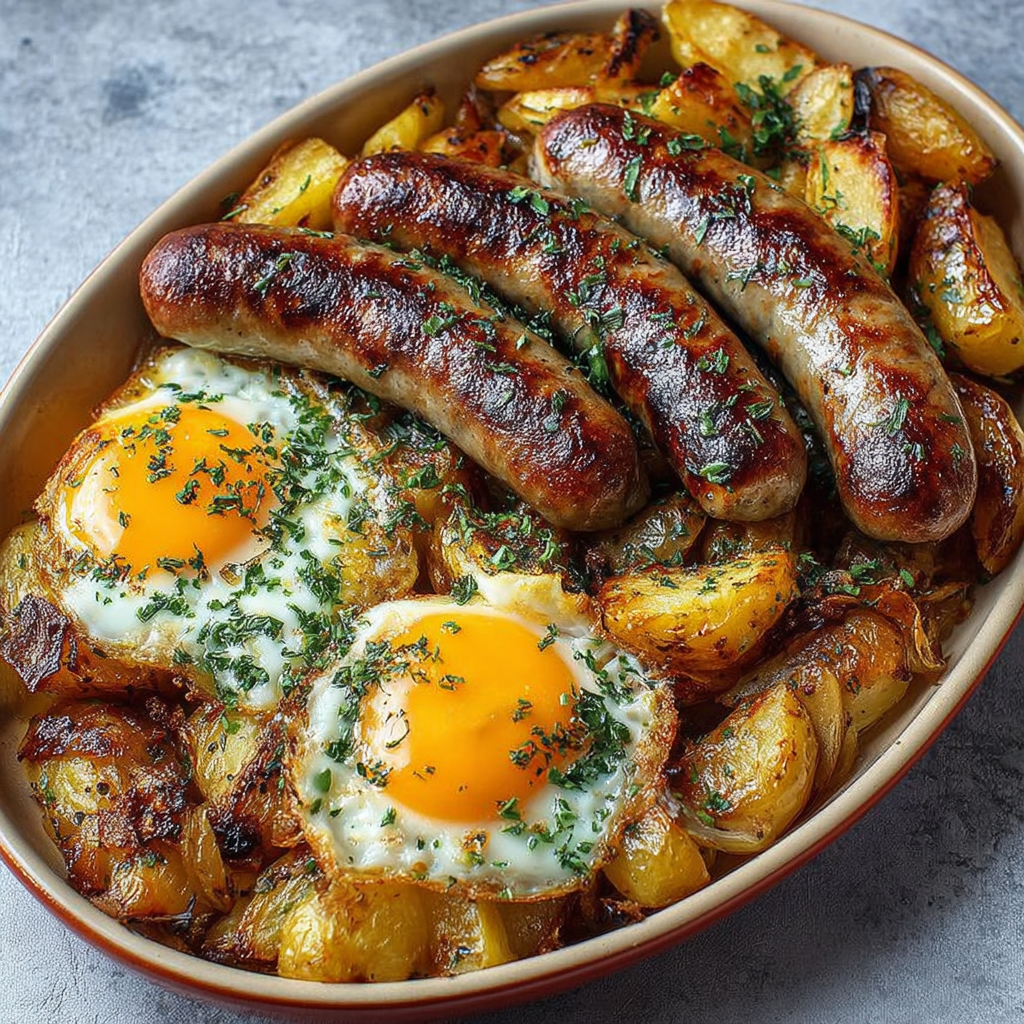 Le plat saucisses au four avec pommes de terre et œufs est un classique simple, réconfortant et complet. Il combine la tendreté des pommes de terre rôties, le goût riche et parfumé des saucisses et la douceur des œufs, pour un repas familial facile à préparer et généreux. Idéal pour un dîner rapide ou un brunch copieux, ce plat réunit tous les éléments pour satisfaire tous les palais.
