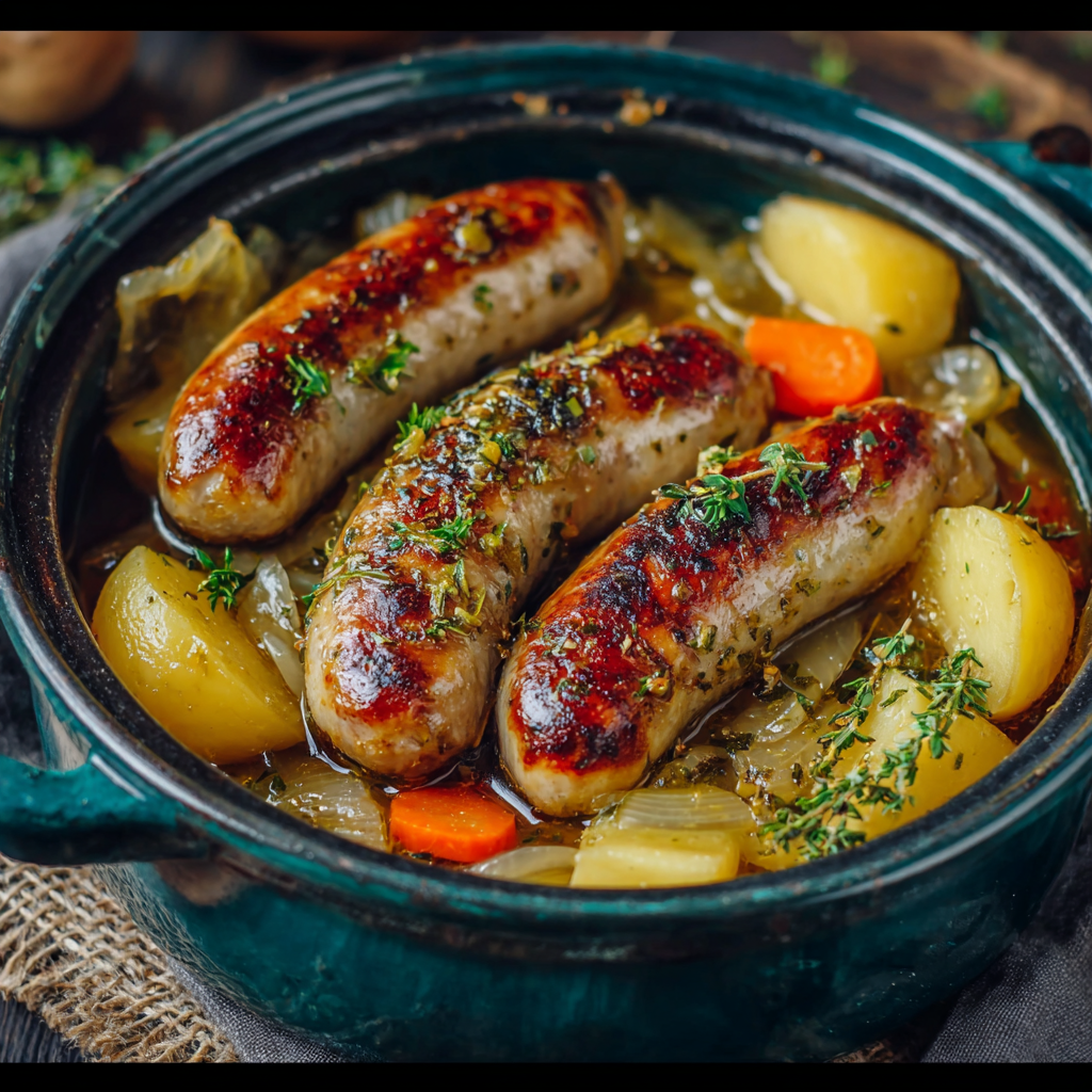 Les saucisses campagnardes en cocotte aux pommes de terre sont un véritable classique des repas familiaux. Ce plat mijoté allie la richesse des saucisses bien dorées à la douceur des pommes de terre fondantes, le tout imprégné de jus parfumé aux herbes. C’est un repas complet, nourrissant et chaleureux, idéal pour les journées fraîches ou pour rassembler la famille autour de la table.