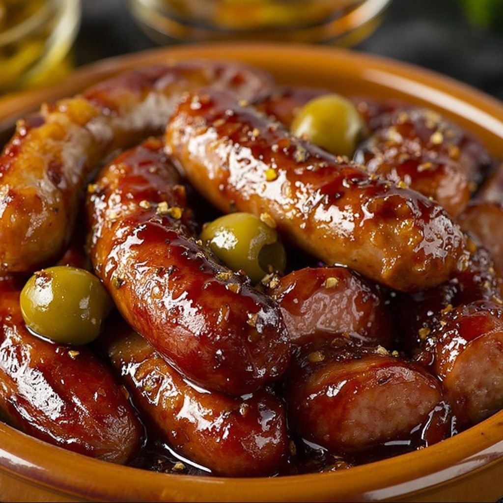 Saucisses caramélisées aux olives vertes