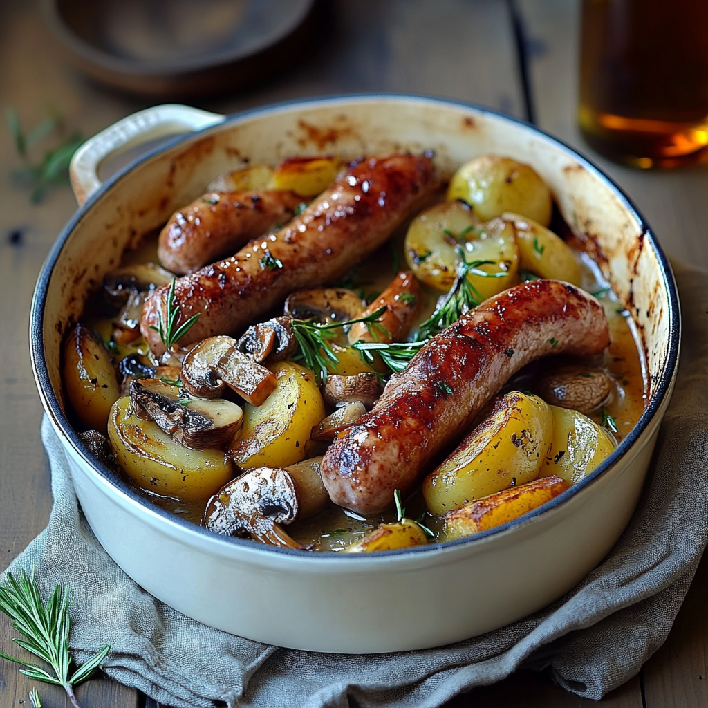 Un plat simple et savoureux où les saucisses juteuses, les champignons tendres et les pommes de terre dorées se marient parfaitement pour un repas complet en toute simplicité.
