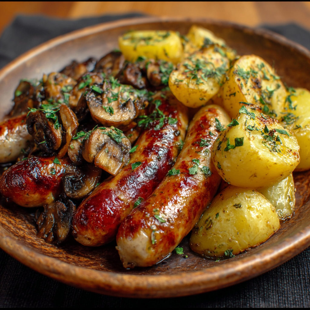 Plat rustique par excellence, cette recette rassemble des ingrédients simples pour un résultat généreux et profondément savoureux. Les saucisses dorent lentement au four, libérant leurs sucs qui imprègnent les pommes de terre et les champignons. Les oignons fondent doucement, l’ail parfume l’ensemble, et les herbes viennent sublimer le tout.