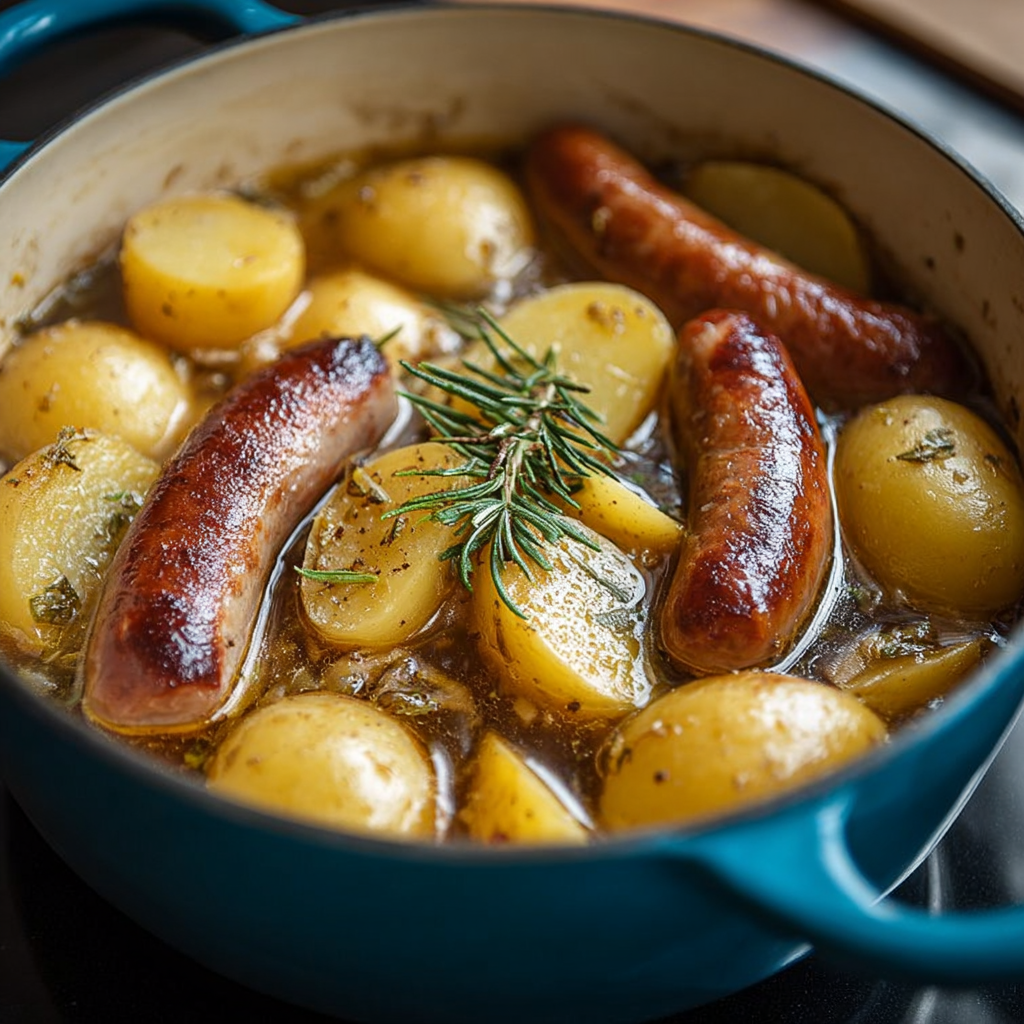 Les saucisses mijotées aux pommes de terre sont un grand classique de la cuisine familiale. Simples, savoureuses et réconfortantes, elles incarnent parfaitement l’esprit d’un repas convivial.