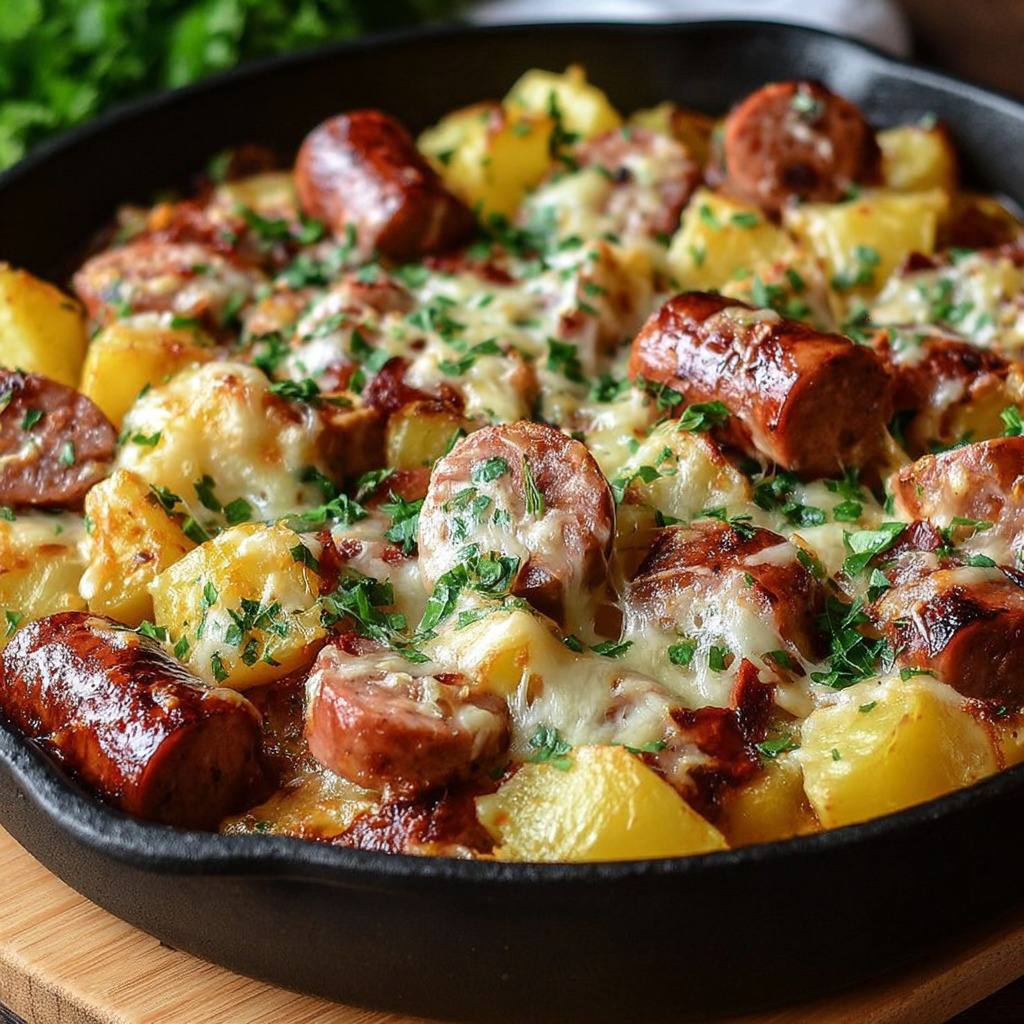 Le sauté de saucisses, pommes de terre et fromage à la poêle illustre parfaitement l’art de la cuisine conviviale et familiale. Il combine simplicité, rapidité et générosité, tout en offrant des saveurs riches et un contraste de textures agréable : la tendreté des pommes de terre, le moelleux des saucisses et le fondant du fromage. Chaque bouchée est savoureuse et réconfortante, faisant de ce plat un incontournable des repas rapides ou des dîners partagés.
