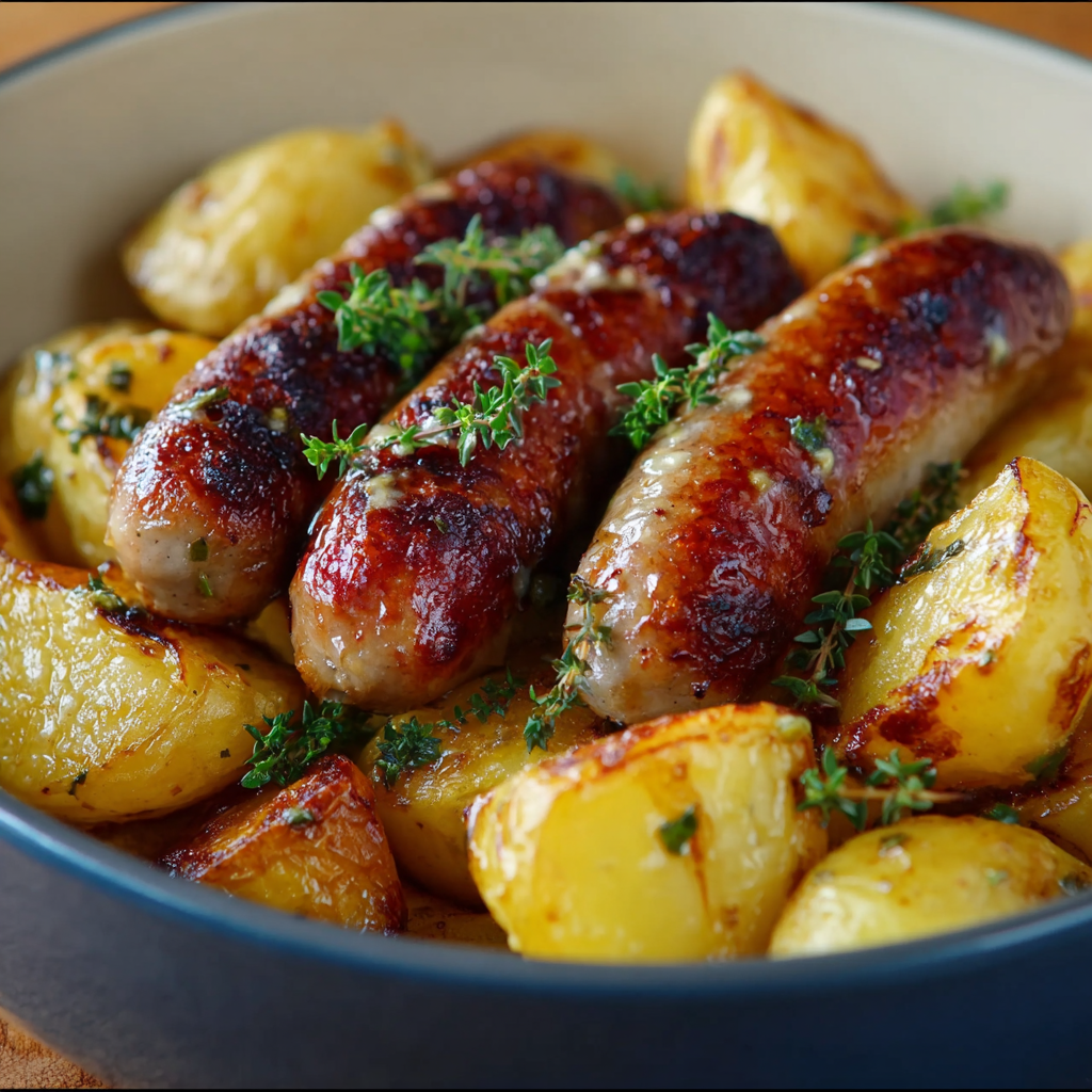 Les saucisses et pommes de terre rôties à la moutarde sont un grand classique de la cuisine du quotidien. Ce plat, à la fois rustique et réconfortant, repose sur une combinaison simple mais efficace : des saucisses juteuses, des pommes de terre croustillantes et une touche de moutarde qui vient relever l’ensemble avec caractère.