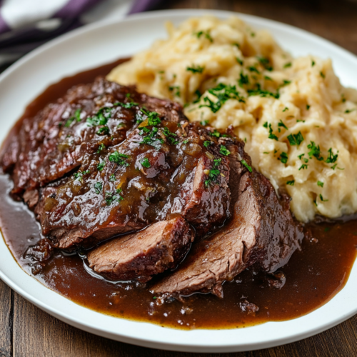 - Napper de sauce : Servez le rôti tranché avec les légumes et nappez généreusement de la sauce. Le Sauerbraten se marie parfaitement avec des pommes de terre bouillies ou une purée de pommes de terre crémeuse, mais vous pouvez également opter pour des légumes grillés ou des nouilles.