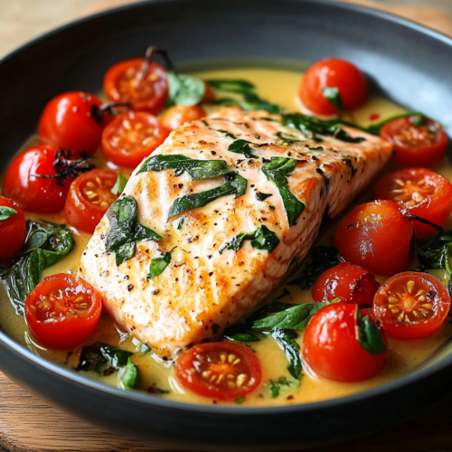 Le saumon à la toscane est un plat qui ravira vos papilles tout en vous transportant en Italie avec ses saveurs méditerranéennes délicates. Ce plat associe la tendreté du saumon avec des épinards frais, des tomates cerises juteuses et une sauce crémeuse à l’ail qui lie l’ensemble de manière exquise. Il est parfait pour un dîner rapide mais raffiné, offrant à la fois des protéines maigres et des légumes savoureux, le tout dans une préparation simple et rapide.