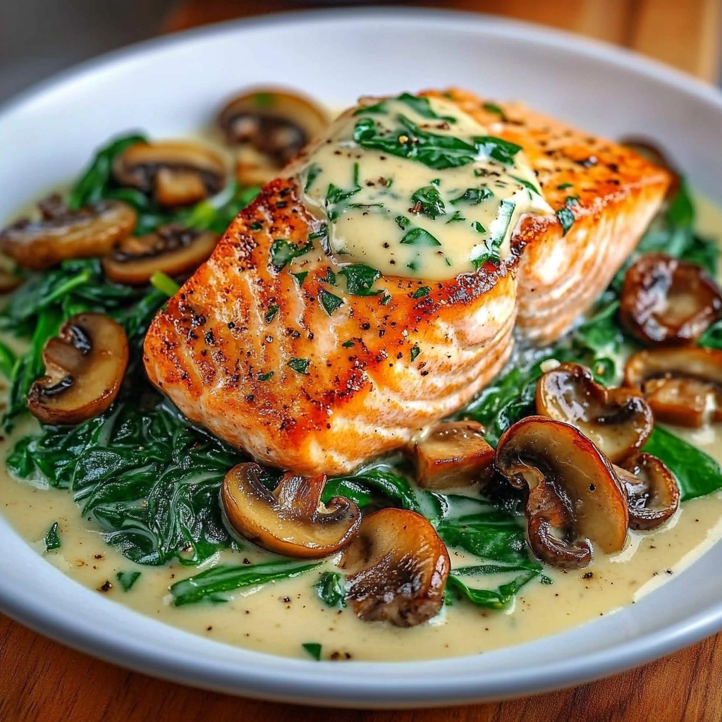 Saumon au Beurre à l’Ail, Épinards et Champignons avec Sauce Crémeuse
