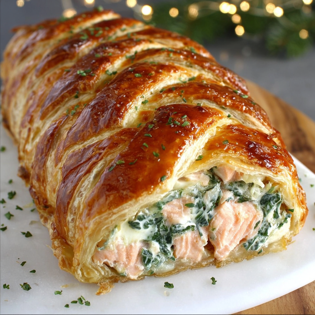 Le saumon en croûte feuilletée façon Wellington est un plat raffiné, élégant et particulièrement apprécié pour les repas festifs ou les occasions spéciales. Inspiré du célèbre bœuf Wellington, ce mets remplace la viande rouge par un filet de saumon tendre et savoureux, enveloppé dans une pâte feuilletée croustillante et dorée. Le résultat est un contraste parfait entre le fondant du poisson, le crémeux de la garniture et le croustillant de la pâte.
