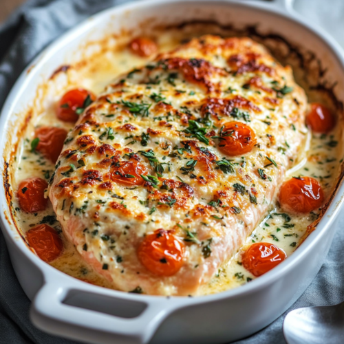 1. Enfournez le saumon pour 20 à 25 minutes, jusqu’à ce qu’il soit bien cuit et que le fromage soit doré.