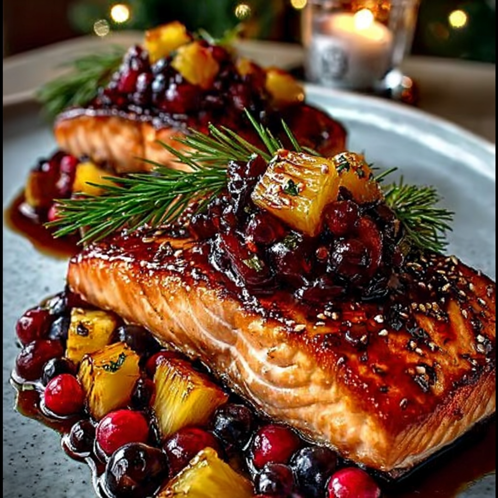 Le saumon laqué de fête accompagné de son relish canneberge-ananas est un plat complet, savoureux et visuellement attrayant. Facile à réaliser, il impressionnera vos convives par ses saveurs équilibrées et sa présentation élégante.